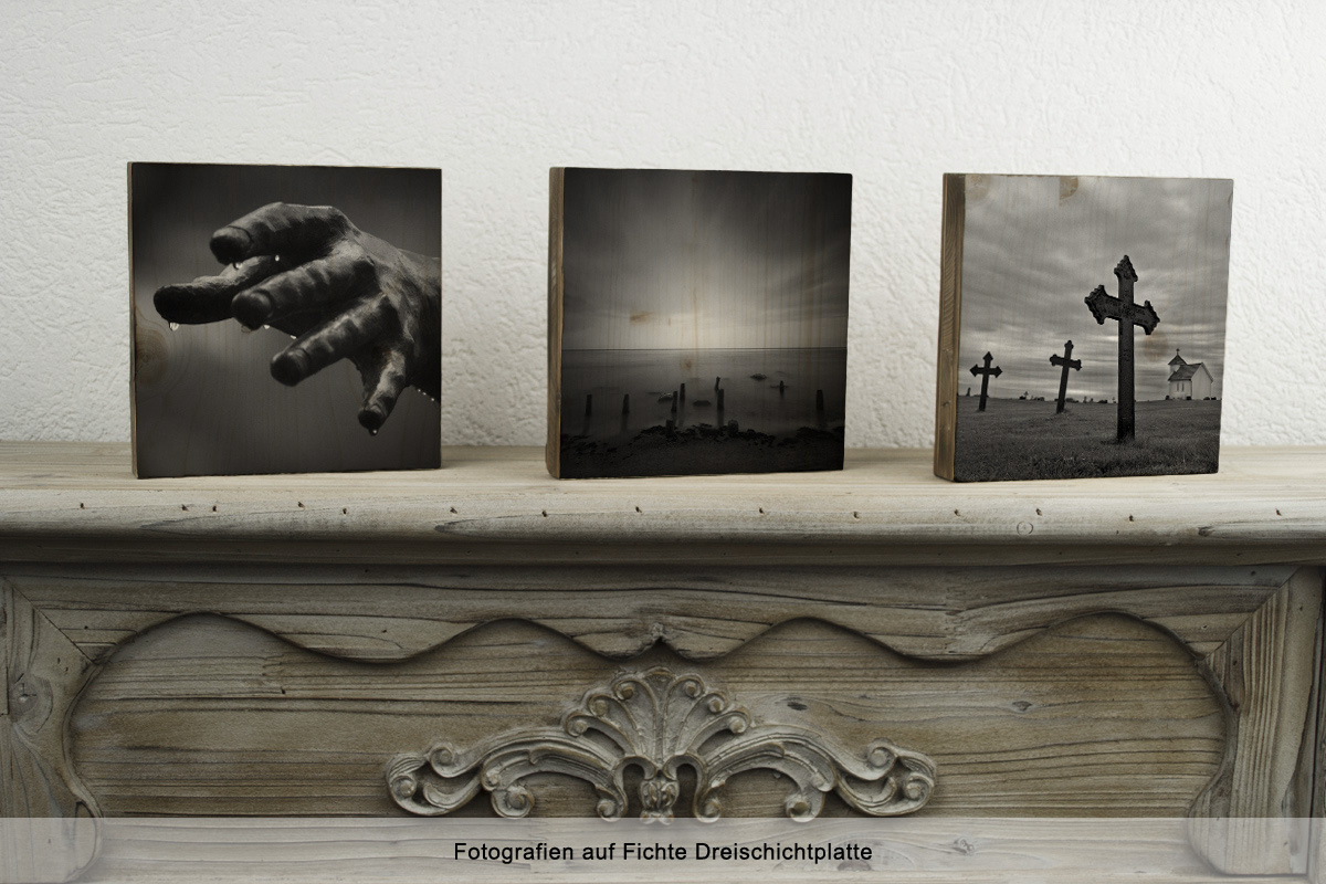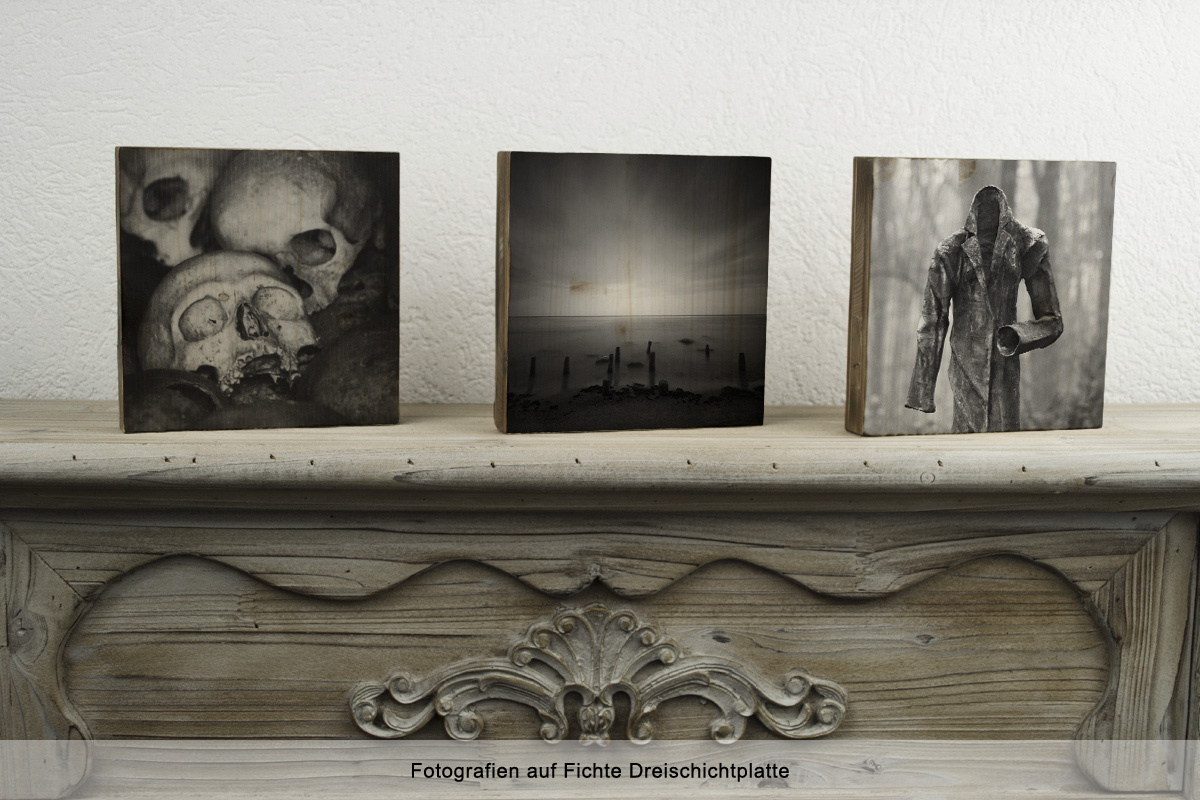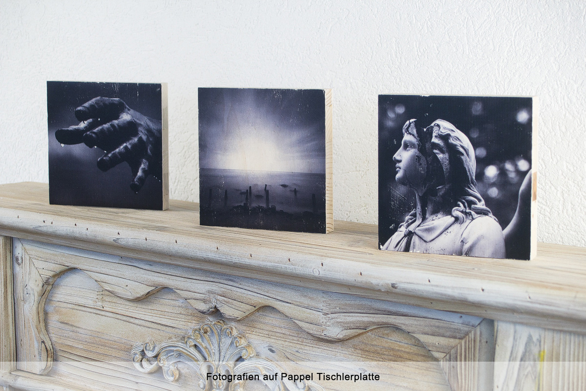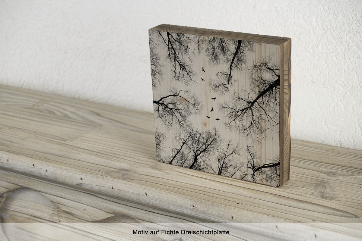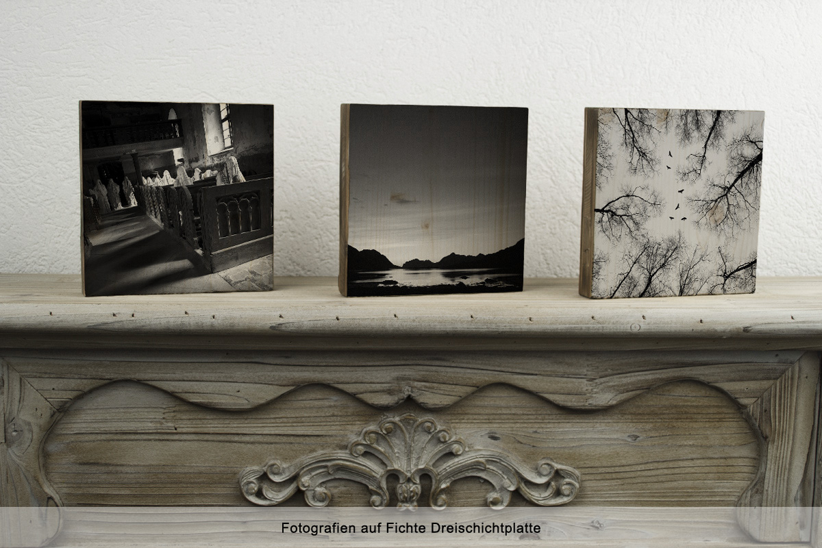 Die drei Motive werden per Hand auf das Holz (Fichte Dreischichtplatte) gebracht und die Ränder des Holzes geflammt. So erhält jedes Bild einen einzigartigen Vintage-Look. Die Struktur des Holzes ist zudem sichtbar.