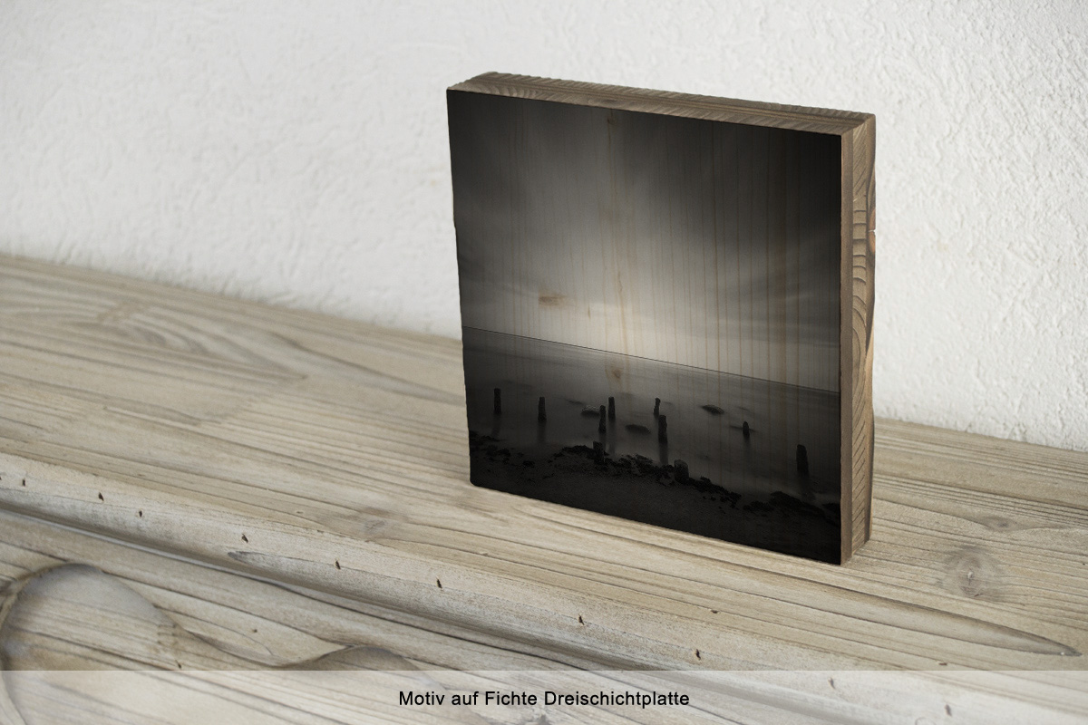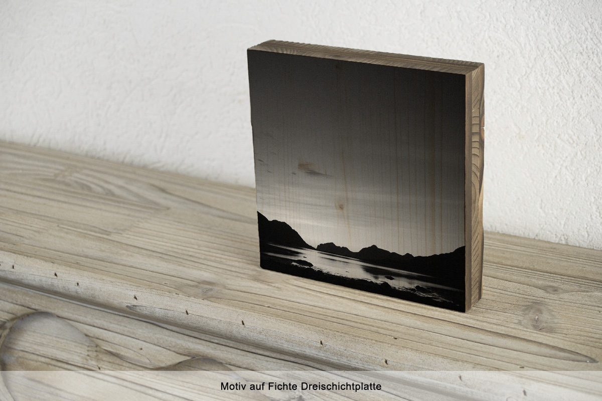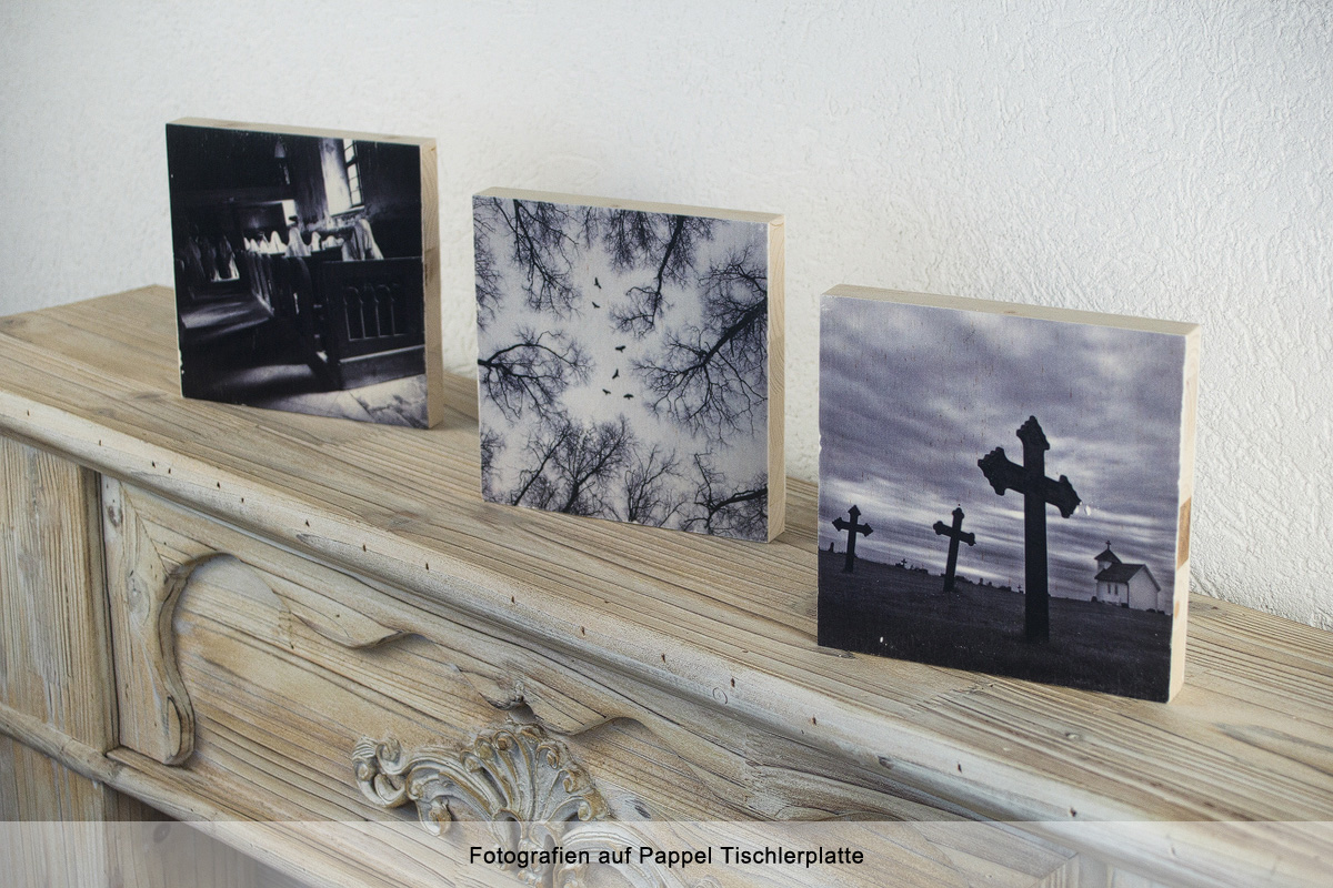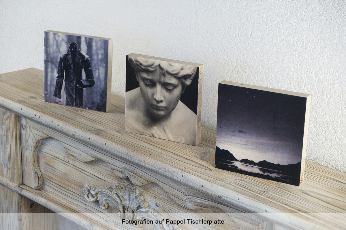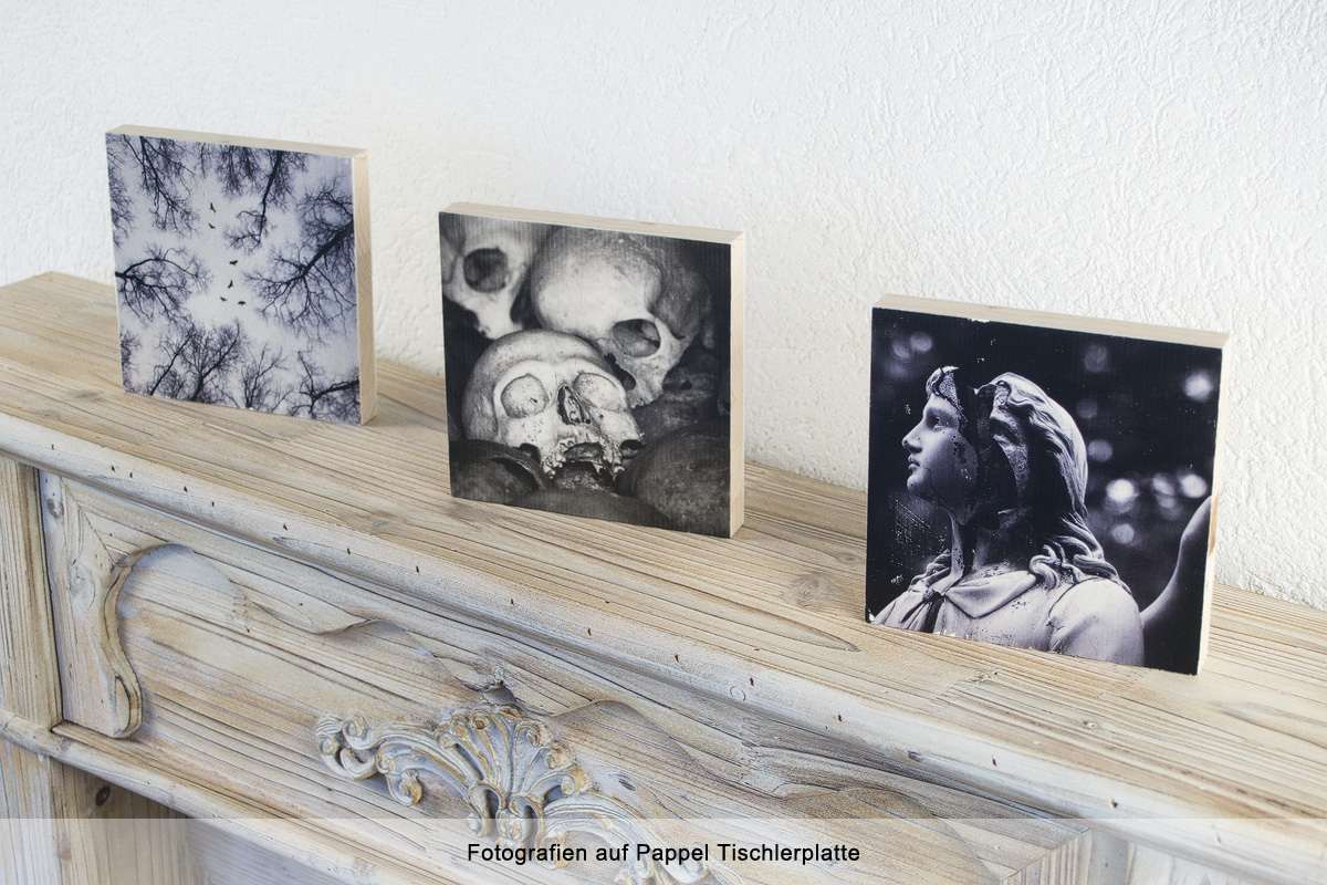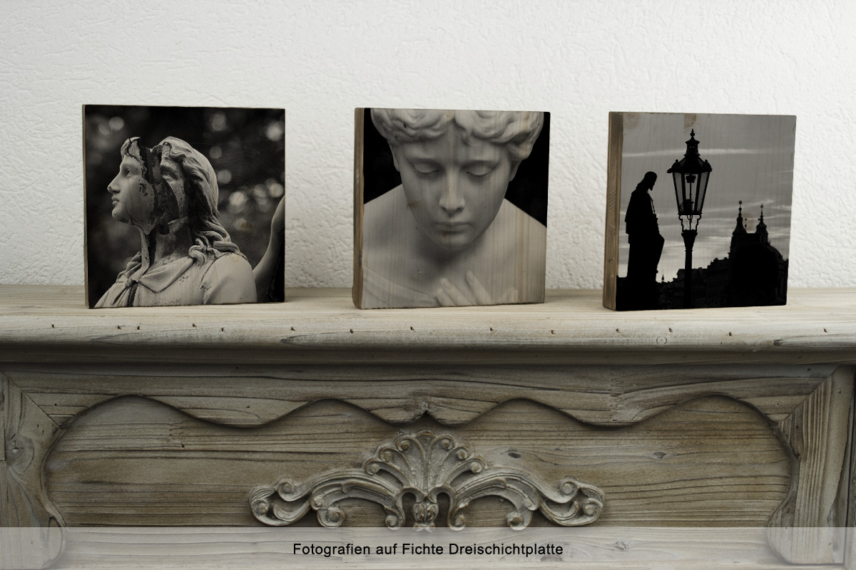 Die drei Motive werden per Hand auf das Holz (Fichte Dreischichtplatte) gebracht und die Ränder des Holzes geflammt. So erhält jedes Bild einen einzigartigen Vintage-Look. Die Struktur des Holzes ist zudem sichtbar.
